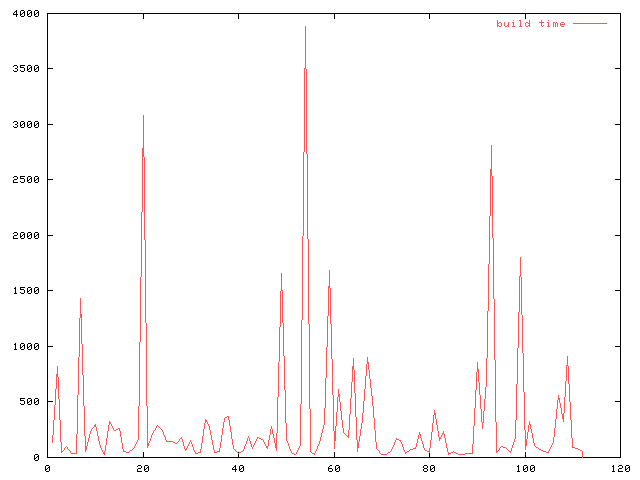 17:28:37 biglooは,binary-indep がコンパイルできない. そういうパッケージが結構あるのだろうか. とりあえず,グラフを作成してみた. 100パッケージくらいコンパイルしてみて, それぞれのパッケージにかかった時間. コンパイルできている確率としては,2つコンパイル できたら1つ失敗するくらいの勢い. gnuchessは謎なくらい時間がかかって,途中であきらめた.